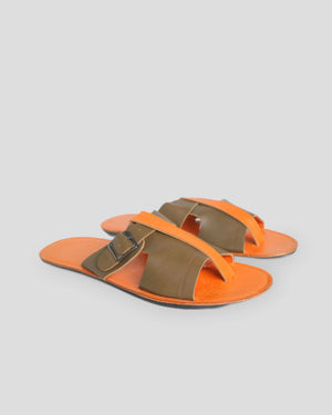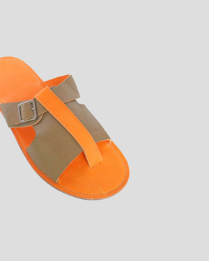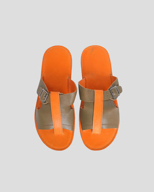 Introducing the Big Foot Sandal, a slip-on toe-loop sandal made from 100% genuine goat leather and meticulously handcrafted by skilled Balinese artisans. Its unique design features a vibrant orange leather footbed paired with an olive-brown leather strap and adjustable buckle, creating a bold yet stylish look.