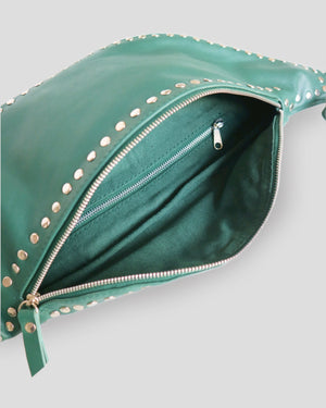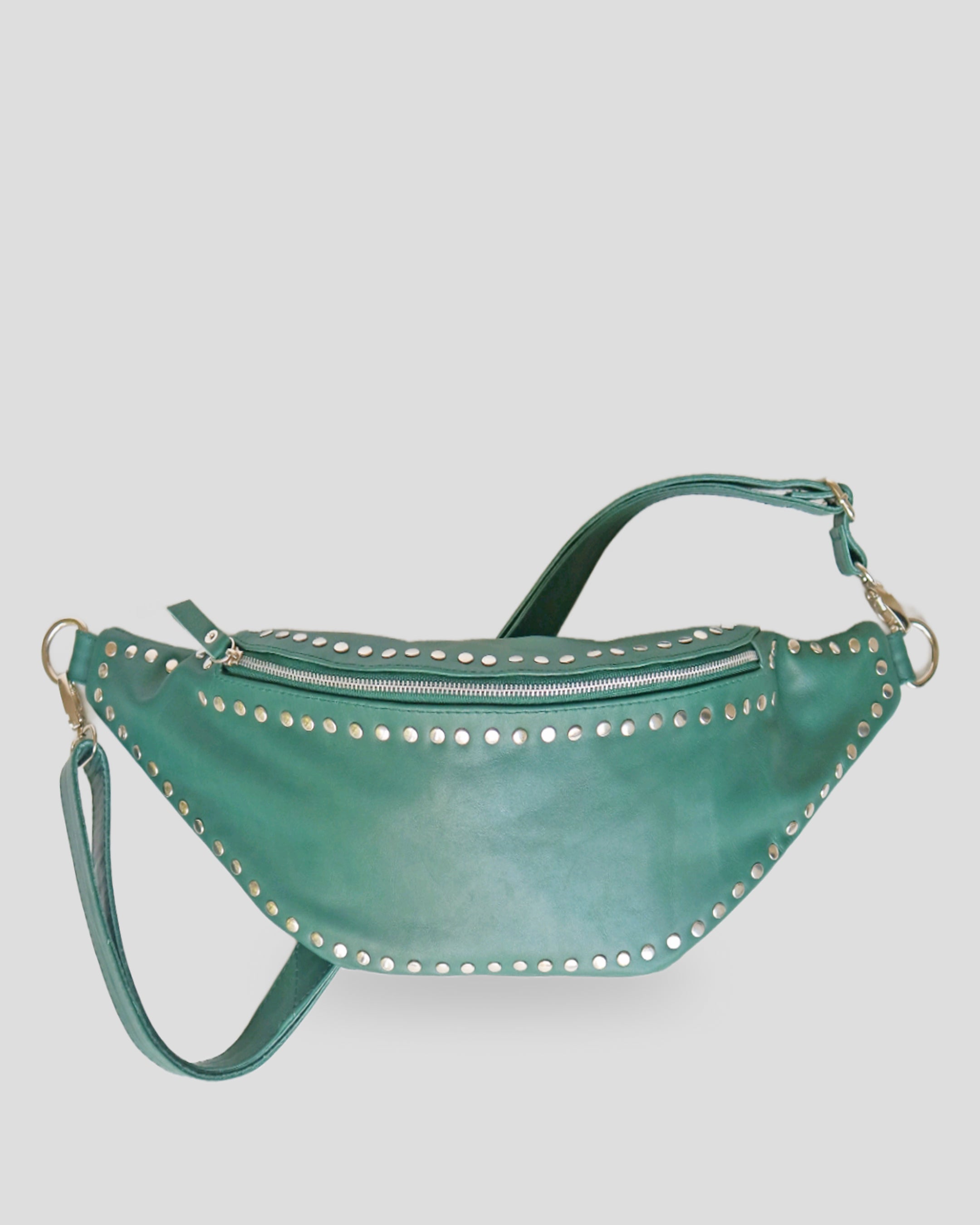 The bag is adorned with silver studs scattered around its surface, featuring a bold yet functional design. The adjustable long strap allows you to wear it on the shoulder or crossbody, providing style flexibility according to your needs.