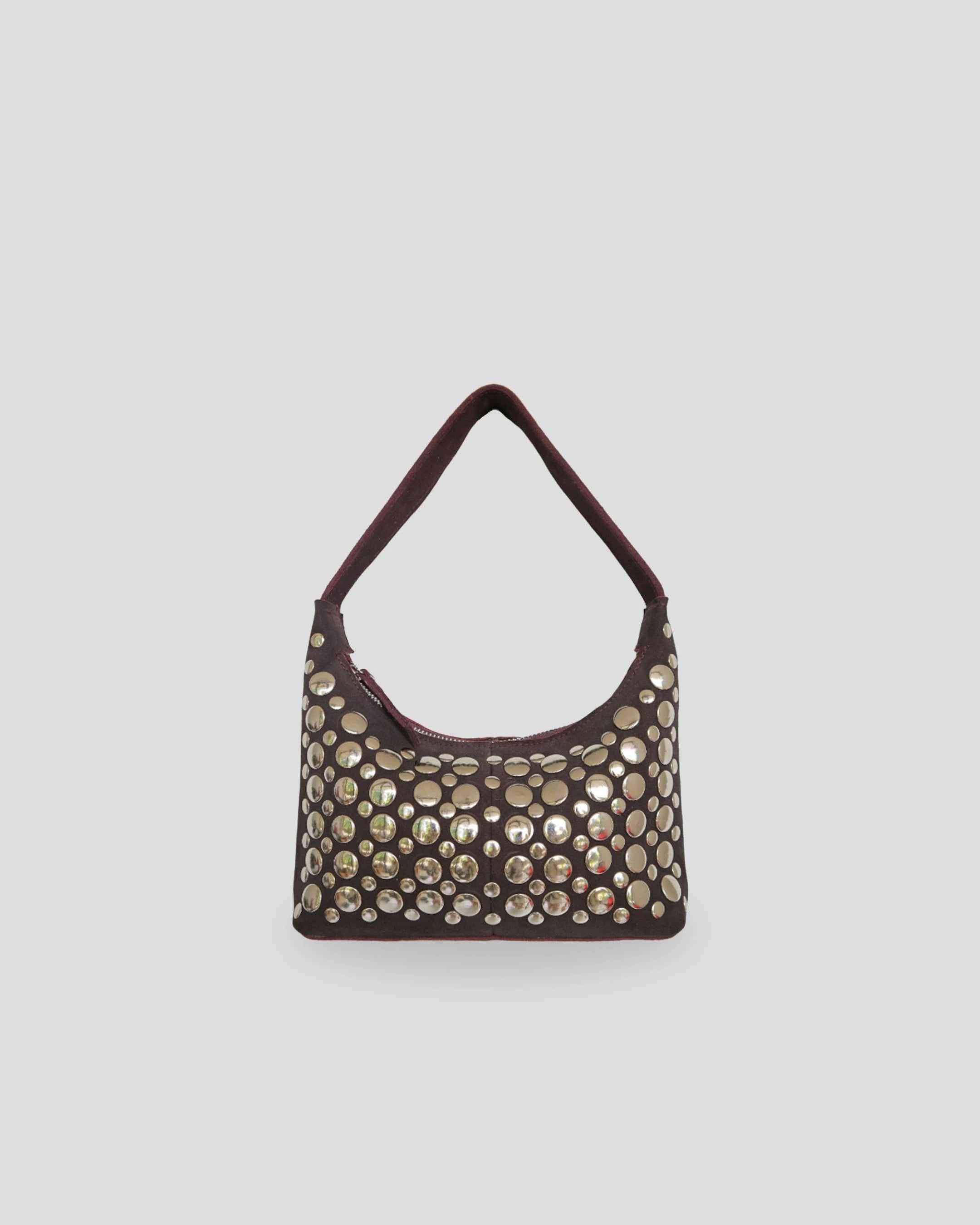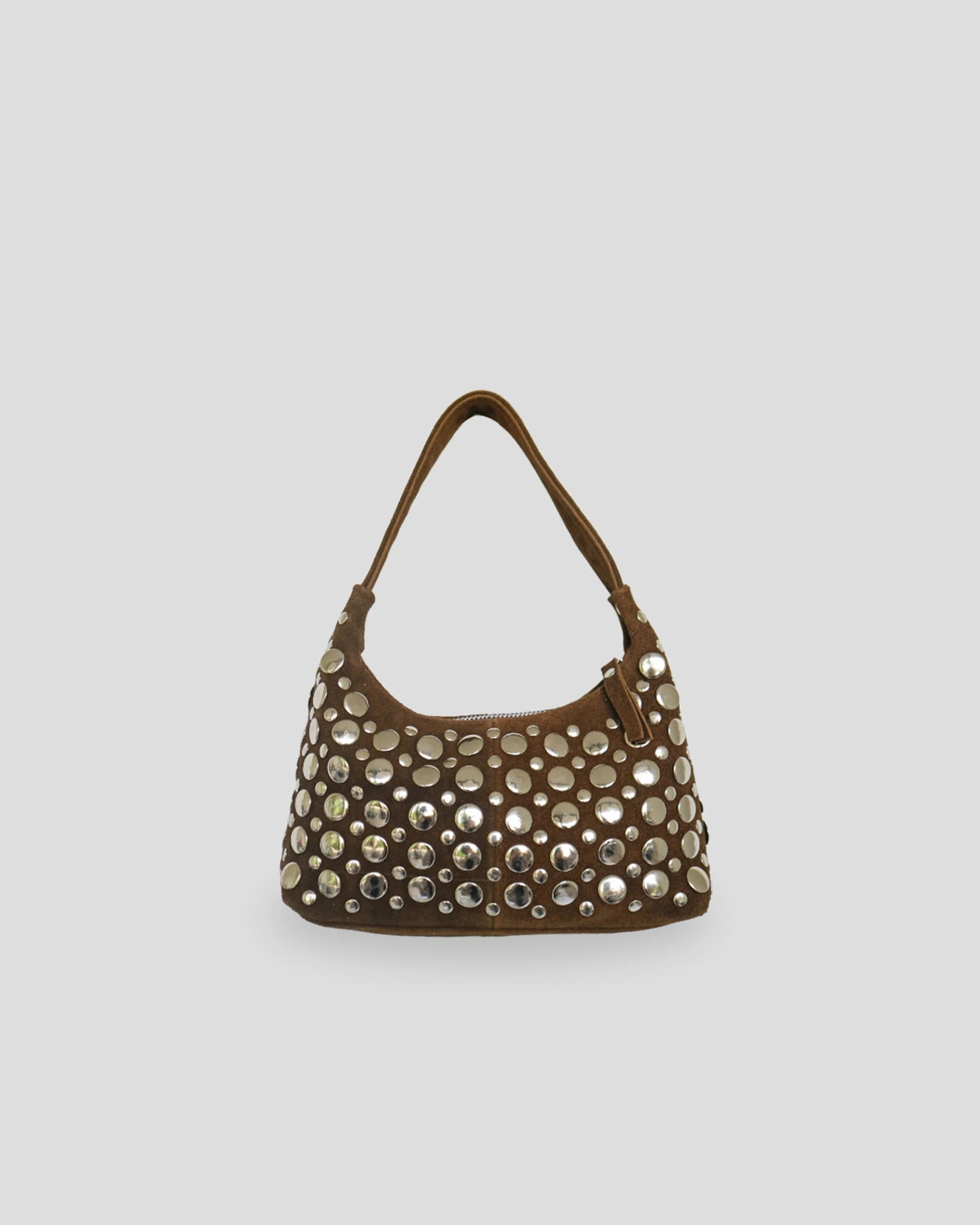 The Lula Suede Bag is a compact shoulder bag crafted from 100% genuine Indonesian cow suede leather. Every detail is carefully handmade by skilled local Balinese artisans. Its soft and refined suede finish makes this bag a perfect choice for both daily use and evening occasions. Designed with a modern and sophisticated touch, the bag is adorned with silver stud accents scattered across its surface, adding a bold yet stylish character. The Lula Suede Bag combines premium quality, unique design, and authentic local craftsmanship. Its size is just right to carry your essentials — from wallet and phone to lipstick. Stand out effortlessly with the Lula Suede Bag.