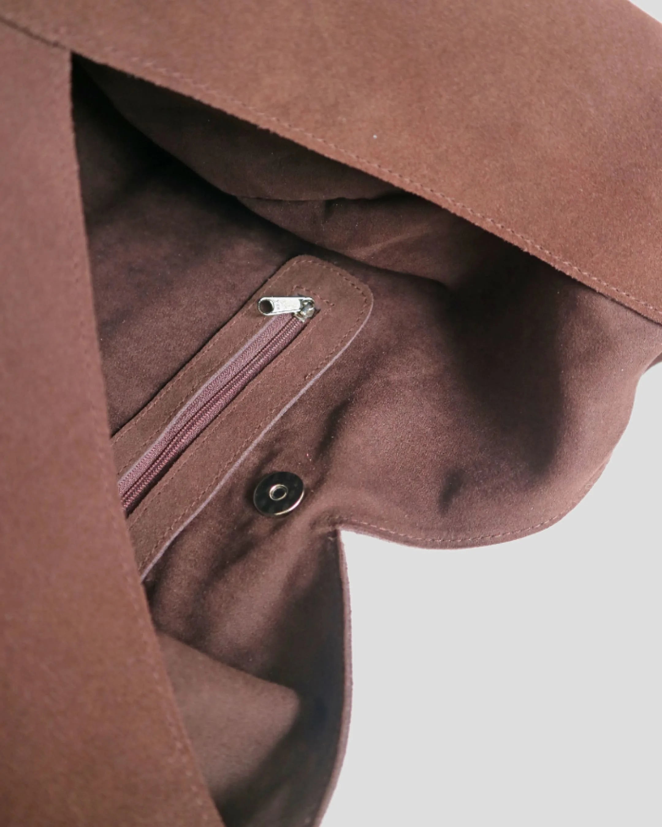 Meet the V Bag Suede, a triangle-shaped hobo bag that is simple yet stylish. Crafted from 100% genuine cow suede leather from Indonesia, this bag offers a soft and comfortable texture. Its distinctive “V” shaped handle adds a modern and edgy touch, making it perfect to pair with your casual everyday outfit, semi-formal look, or effortless weekend style.