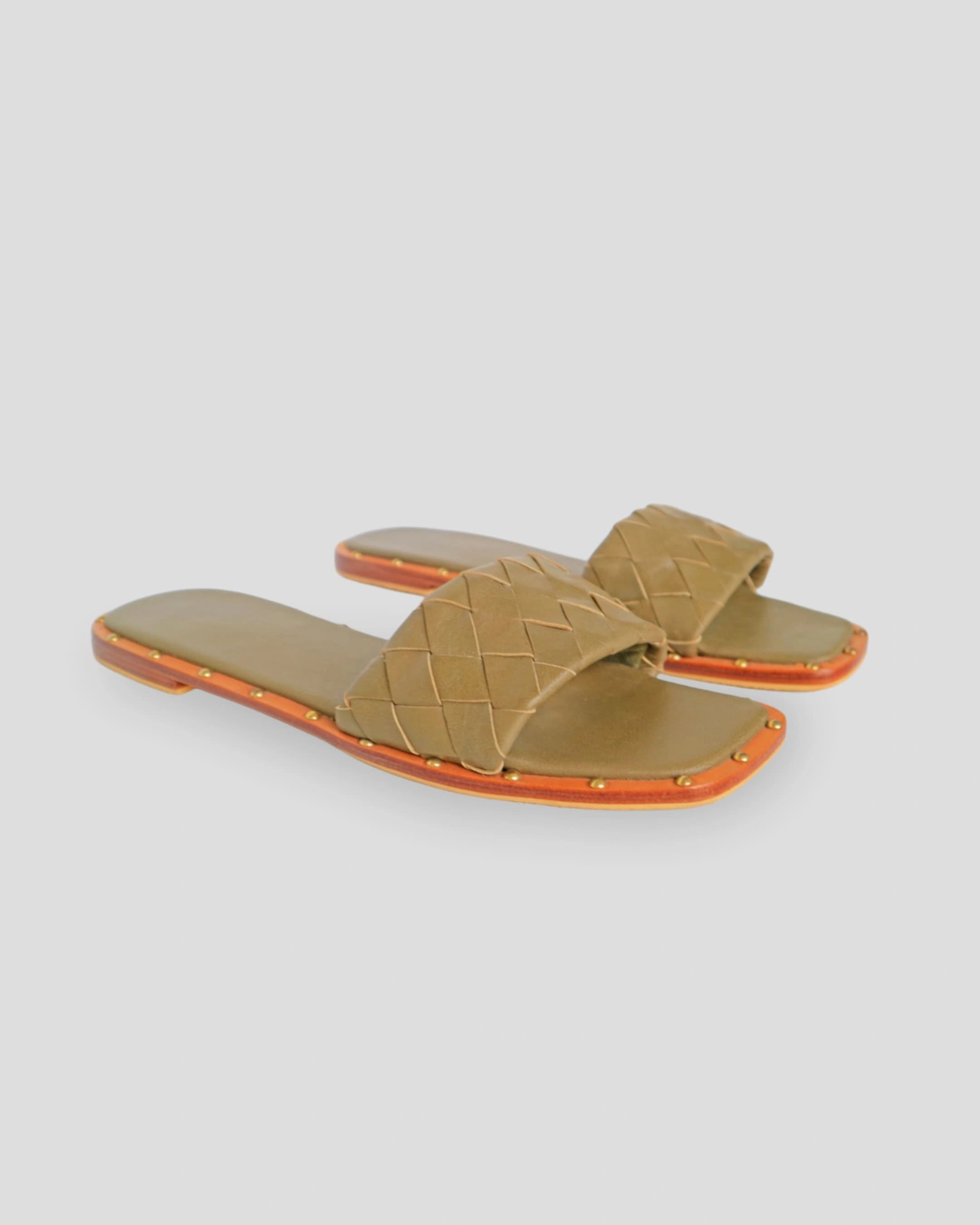 Bella Sandal – Handmade Leather Woven Flats with Vintage Stud Details